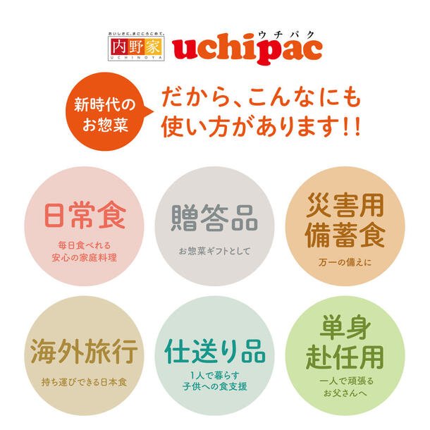 国産の大豆、人参、じゃがいも、えのき、ズッキーニの5種類の野菜を食べやすいケチャップ煮に仕上げました。ケチャップの味が勝ってしまいがちですが、内野家独自の製法により野菜それぞれの味と食感を残し、酸味は控えめのやさしい味付けが特徴で、特にお子様におすすめです。