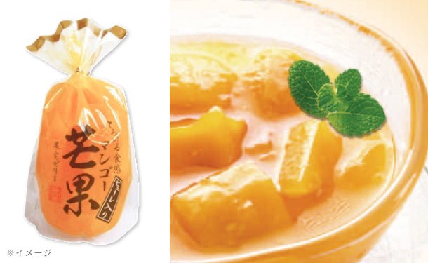 熟したマンゴーの果実を、マンゴーピューレのやわらかゼリーで包み込みました。
