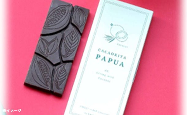 パプア州産カカオ豆を使用し、産地であるパプアを感じられる味わいとしてココナッツを配合したチョコレートです。ミルクの柔らかい風味、ココナッツの香ばしさ、そしてカカオマスのフルーティな香りが合わさった、食べ応えのある1枚です。