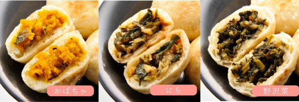キャベツをメインに、信州味噌で味付けをした野菜をたっぷり入れたおやきです。化学調味料を使用していない、自然のうまみたっぷりのおやきです