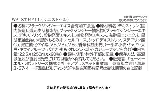 ブラックジンジャーがお腹の脂肪を消費!WAISTHELLはお腹の脂肪を消費するブラックジンジャーを配合。その他代謝をサポートする黒ニンニク・黒酢もろみ・黒胡椒と、173種類もの植物素材を発酵し生きたまま届ける生の酵素を配合。ぽっこりお腹が気になる方へのダイエットサポートサプリメントです。
