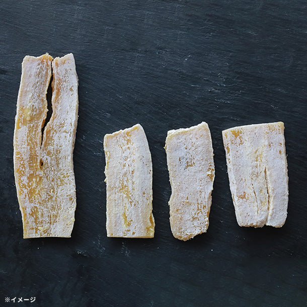 さつまいもの水分が低下した際に発生する「シロタ」、干し芋の表面にさつまいもの糖分である麦芽糖が再結晶化し粉を吹きしろくなったもの、スジが入ったものなど訳ありほし芋を中心に「お得な大容量」サイズでご用意致しました。甘味は控えめです。