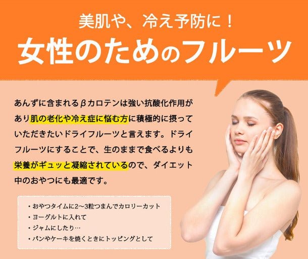 あんずにはβカロチンが含まれており、肌の老化や冷え性改善にも期待できます。