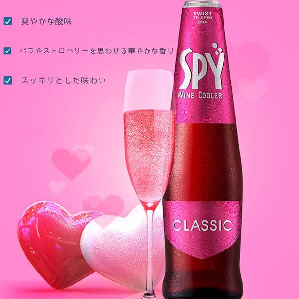 SPYクラシックは、地元のぶどうから作られる赤ワインと白ワインをベースに天然炭酸水、フルーツエキスなどをプラス。ミックスベリーフレーバーで、バラやストロベリーを思わせる華やかな香りが特徴。美しいピンク色で、甘味のあるロゼワイン風の仕上がり。